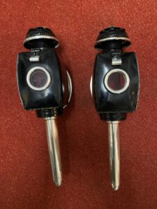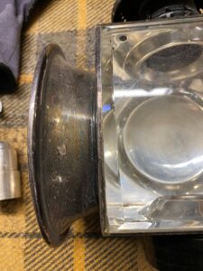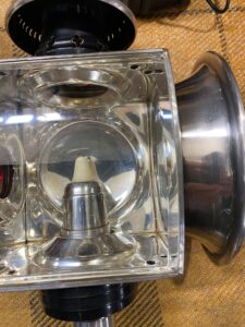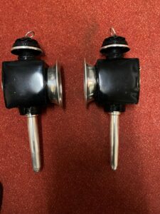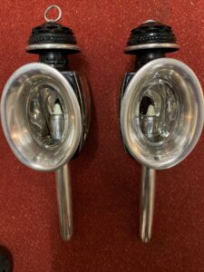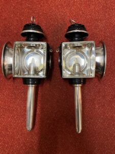1 Paar schwere Kutschenlampen, innen und aussen versilbert. Höhe 45cm, Seitengläser bombiert und geschliffen 13x12cm, Front 15x12cm. Preis Fr. 300.-