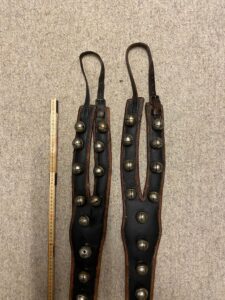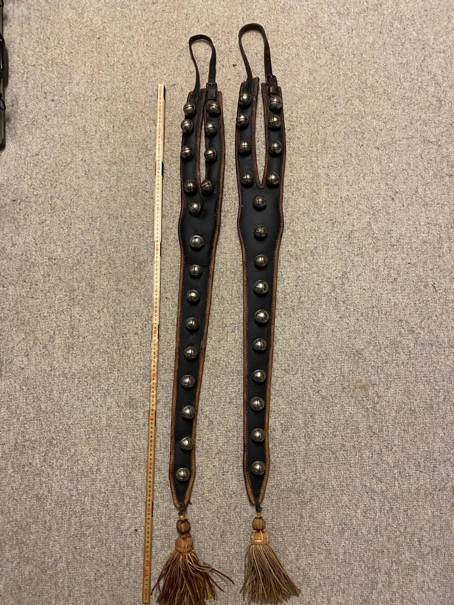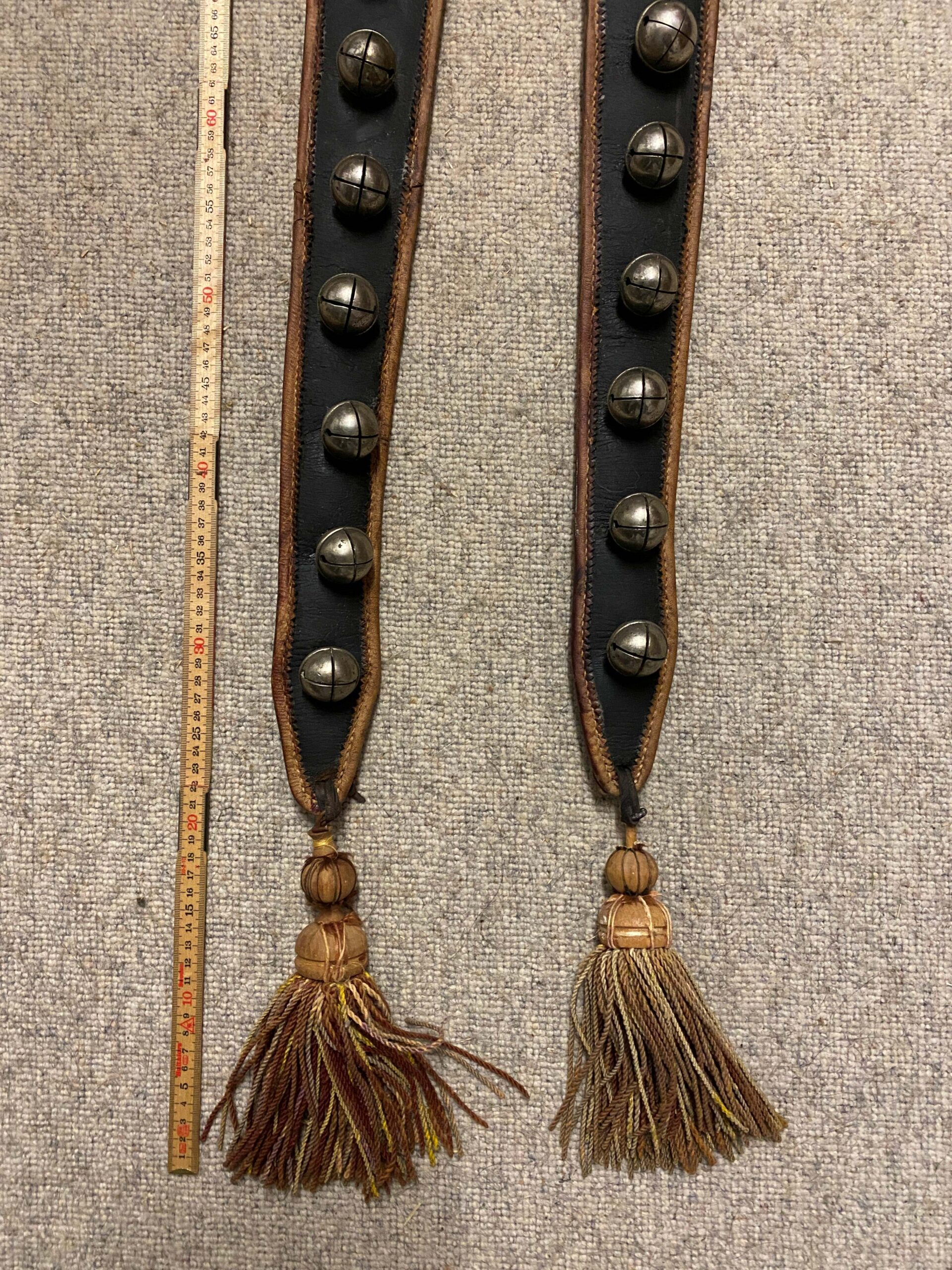 1 Paar antike Seitengrölle mit je 18 Schellen, alles in Leder eingefasst, keine Stoffbezüge. Länge ca. 120cm. Als Deko oder für Schlittenfahrten zum befestigen am Kammdeckel oder Kummet. Preis zusammen Fr. 170.-