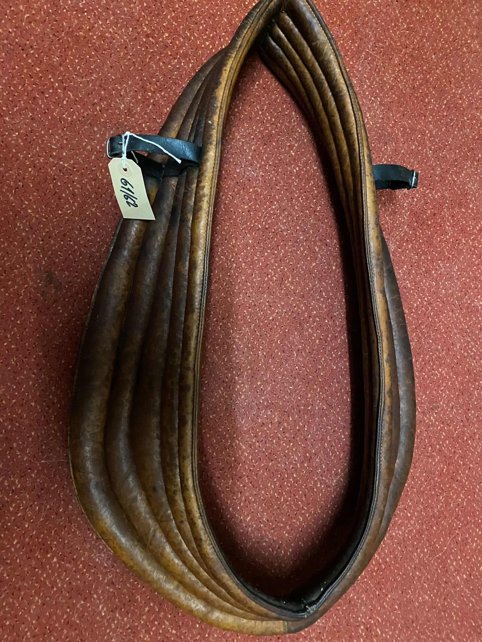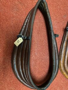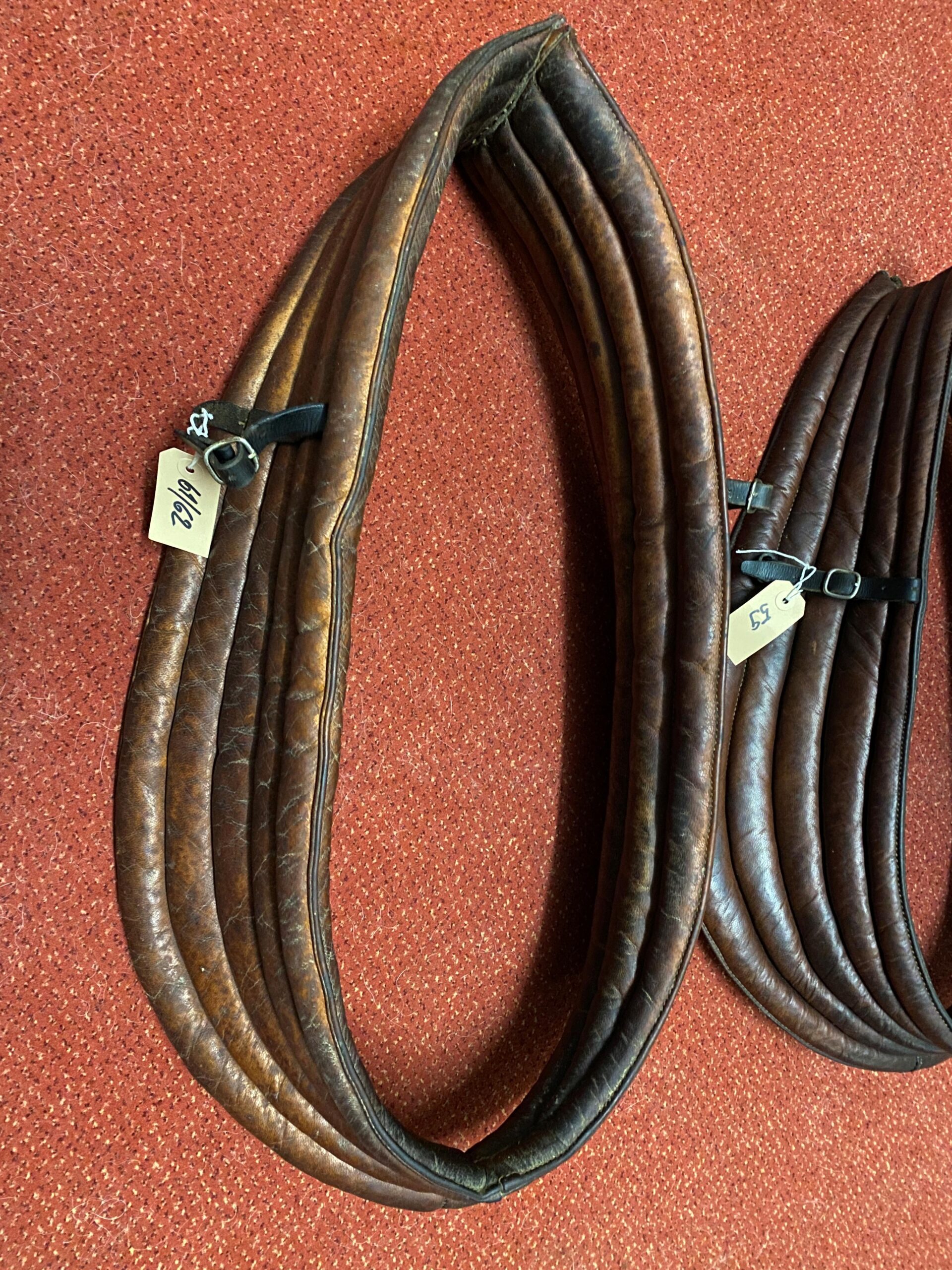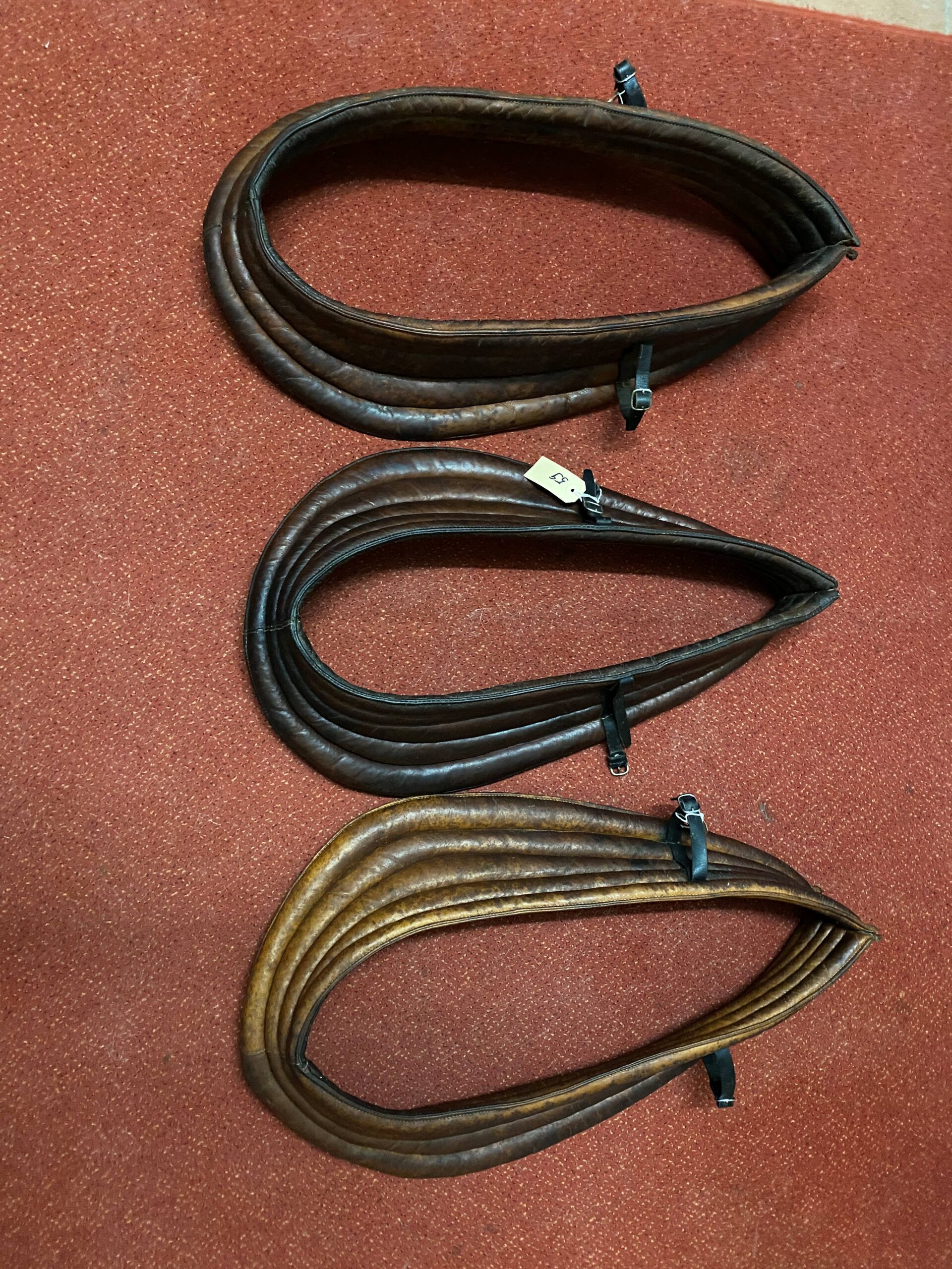 3 gebrauchte Lederunterkummete für englisch Geschirre oder leichte Arbeitskummete. Grössen