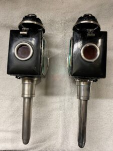 1 Paar antike, schwere Kutschenlampen für 2-Räder oder leichtere Kutschen. Innen sowie aussen alles versilbert. Signiert mit: C. A. B. COACH BUILDERS, LINCOLN. Seitengläser 11cm x 15cm. Front 11 cm x 15cm. Gesamthöhe 45cm. Preis Fr. 350.-