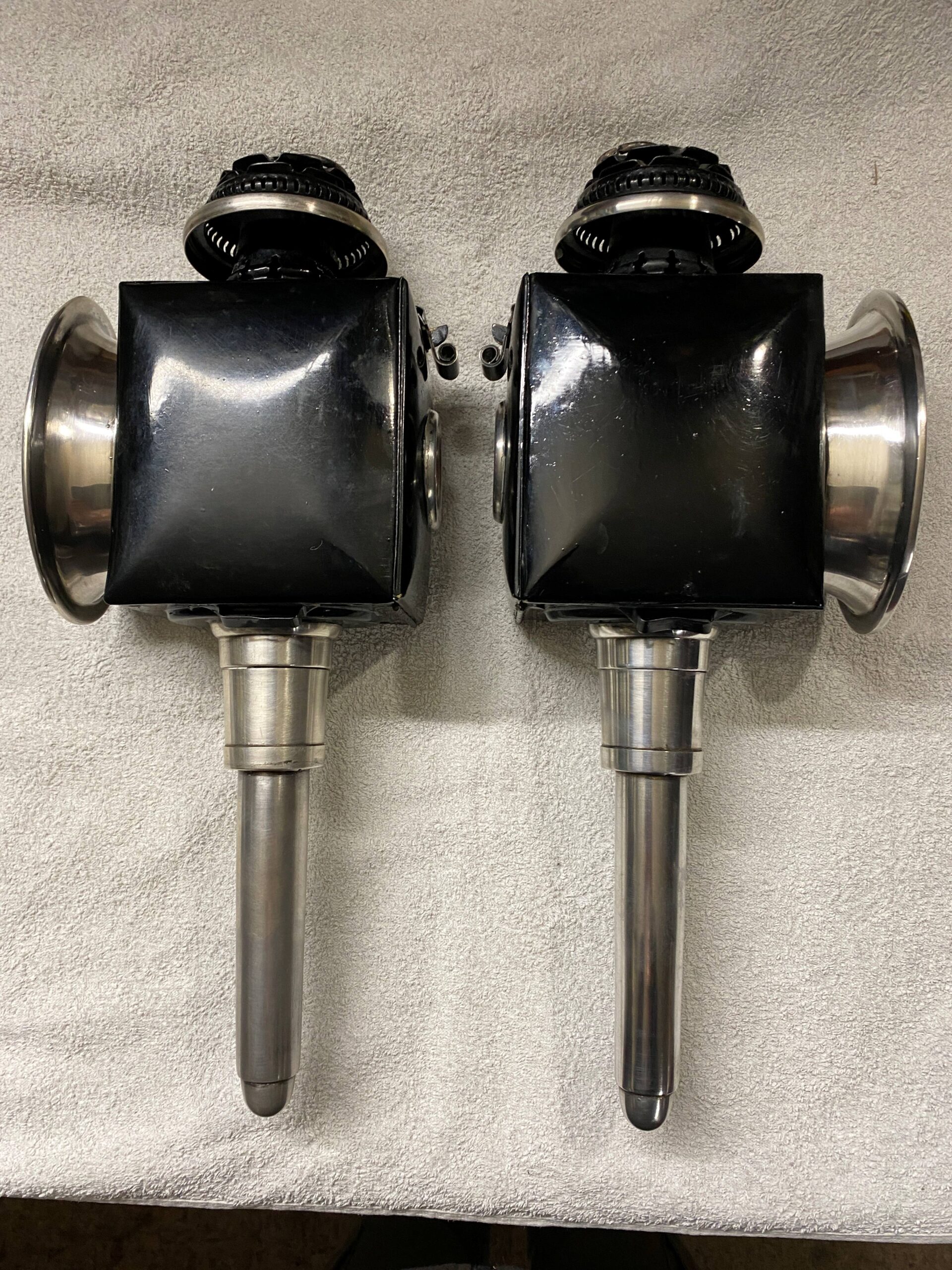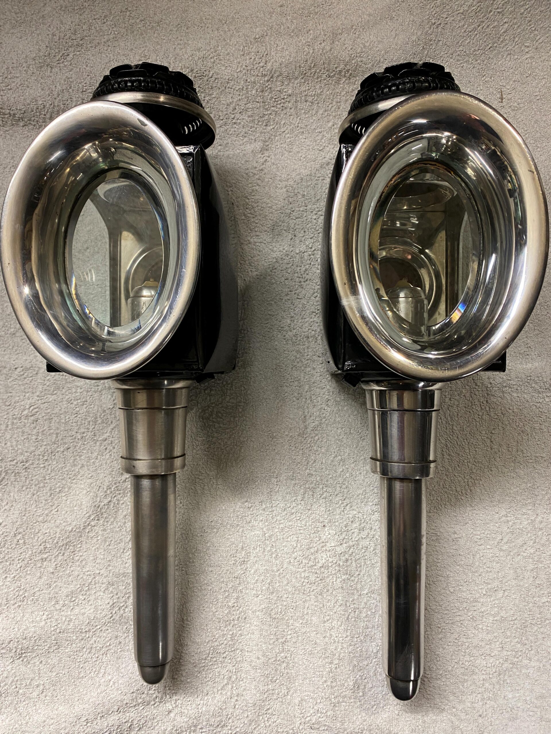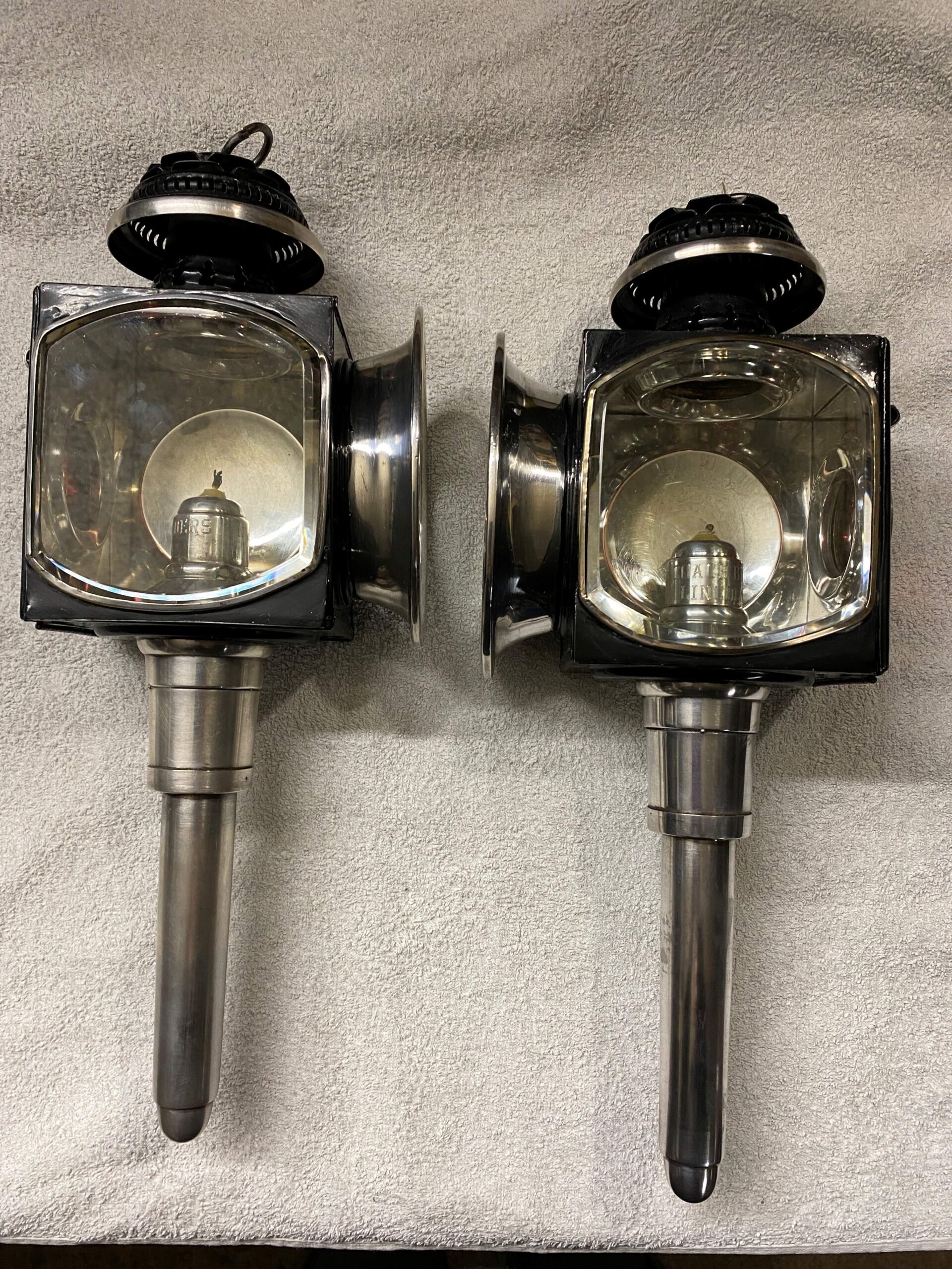 1 Paar antike, schwere Kutschenlampen für 2-Räder oder leichtere Kutschen. Innen sowie aussen alles versilbert. Signiert mit: C. A. B. COACH BUILDERS, LINCOLN. Seitengläser 11cm x 15cm. Front 11 cm x 15cm. Gesamthöhe 45cm. Preis Fr. 350.-