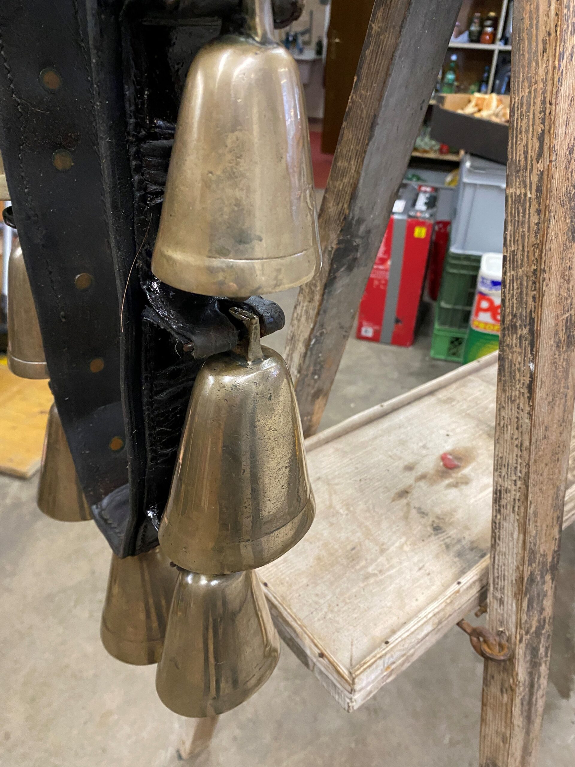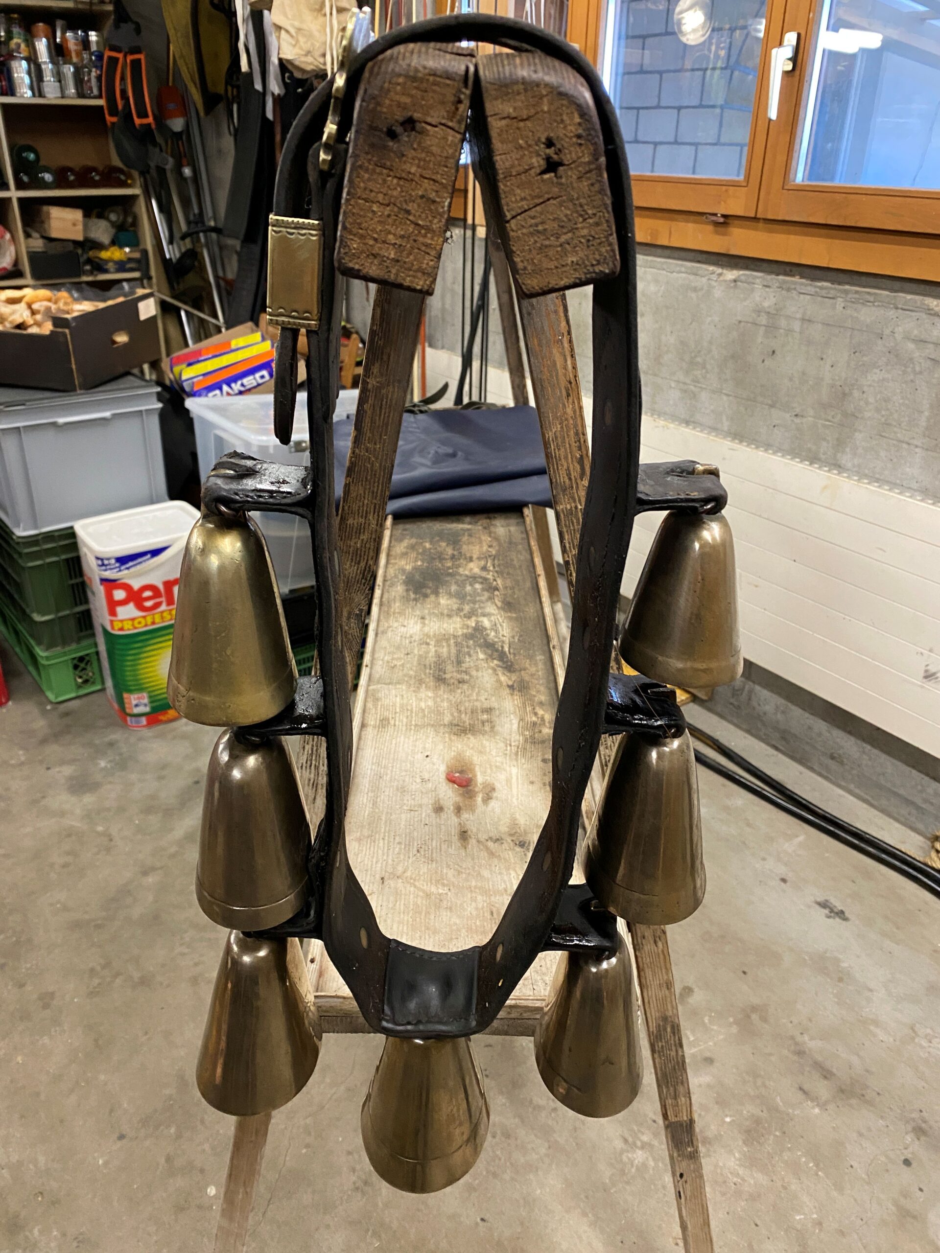 Antikes, schweres Halsgeschell mit beeindruckenden Klang abzugeben. Hergestellt von der Sattlerei Maier in Gais AR mit sehr schönen Messingbeschlägen. Preis Fr. 170.-