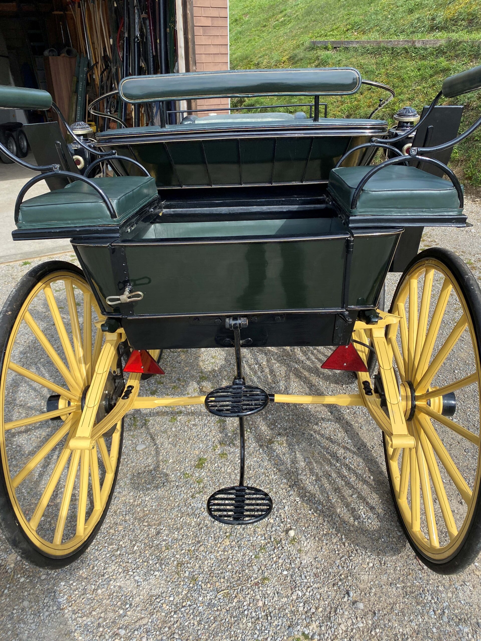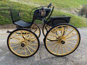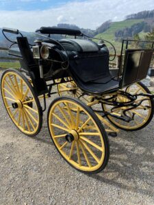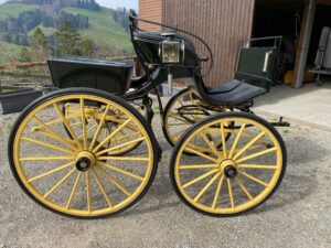 Elegantes schweizer Klappbreak ca. 100 jährig mit Gummibereifung und Scheibenbremsen. Gebaut von der Firma SEITZ in HEMISHOFEN TG. Ausstattung: echt Leder Poster, hinten Sitze für 2 Personen, einklappbarer Auftritt, Bogenlanden und 2-spänner Vorrichtung. Inkl. antiken, versilberten Lampen. Radgrössen 95 und 110cm, Spurbreite 130cm, Sitzhöhe ohne Keil 140cm. Verkauft